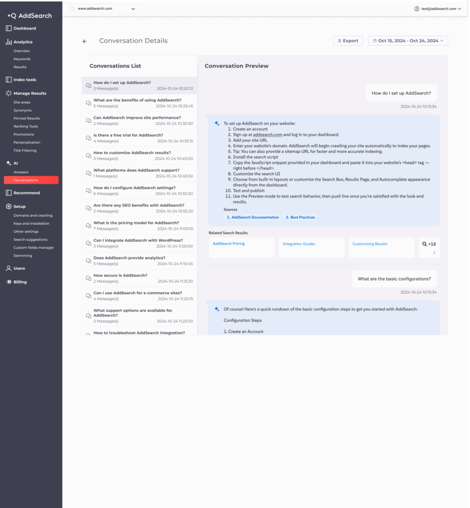 The journey to exceptional conversational AI search begins with understanding your options and seeing what’s possible for your specific use case. AddSearch’s AI Conversations brings enterprise-grade conversational search capabilities to your website with the flexibility, reliability, and features covered throughout this guide.